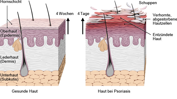 Normalerweise dauert es etwa vier Wochen, bis die Keratinozyten die oberste Hautschicht durchwandern und als tote Zellen abgestoßen werden. Bei einer Schuppenflechte teilen sie sich fast 10-mal so schnell und wandern in nur vier Tagen an die Hautoberfläche. Dann können die toten Zellen nicht schnell genug abgestoßen werden, die Haut wird an den betroffenen Stellen dicker und schuppt viel stärker als normal.